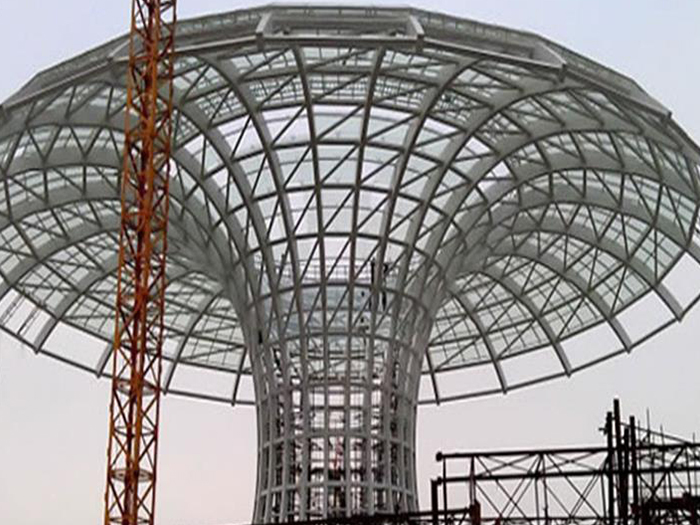 二、球形网架结构因其结构新颖,受力合理,自重轻、用钢量低等优点。如大型体育场馆球形井冈山螺栓球网架、公共场馆球形网架、电厂井冈山螺栓球网架、水泥工业球形网架、仓储物流球形网架、井冈山干煤棚工业球形网架、井冈山收费站井冈山加油站球形网架、展览中心、影剧院、商场、航站楼、候车厅、工厂井冈山车间、仓库、电视塔等球形螺栓球节点网架。国内球形网架结构主要分为:井冈山焊接球节点网架及螺栓球节点网架两种。螺栓球节点网架其构件工厂内加工量较大,现场安装便捷,适用于现场工期紧,井冈山施工条件、用电量受制约,网架形状复杂、井冈山杆件定位困难的异形结构。螺栓球节点球形网架系统基本由井冈山杆件、螺栓球、支撑支座等组成。按照节点形式可分为交叉井冈山桁架体系、四角锥体系、三角锥体系等。支撑方式多为固定支座支撑。对于大面积、大跨度及有特殊受力或伸缩要求的网架结构可采用橡胶支座、滑移支座、球铰支座等支撑形式,以满足结构自身的受力稳定、均衡,便于内力释放等设计要求。